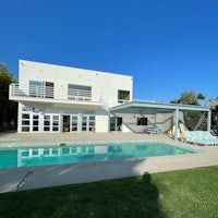 Bauhaus style architectural Malibu canyon pool home with hot tub, overlooking Carbon Canyon with magnificent ocean views, and unique interior design.